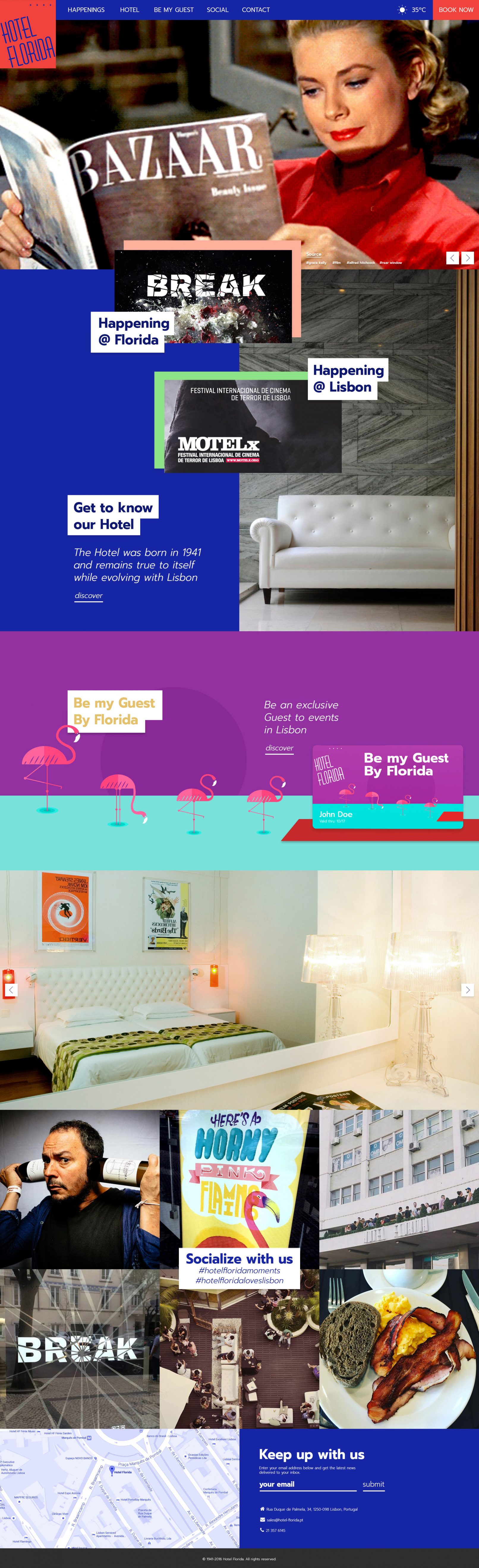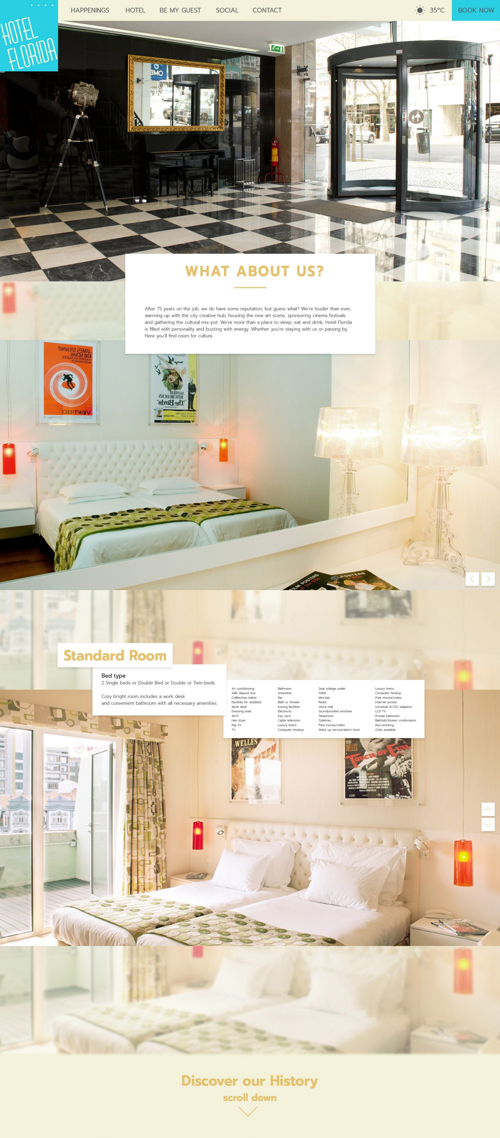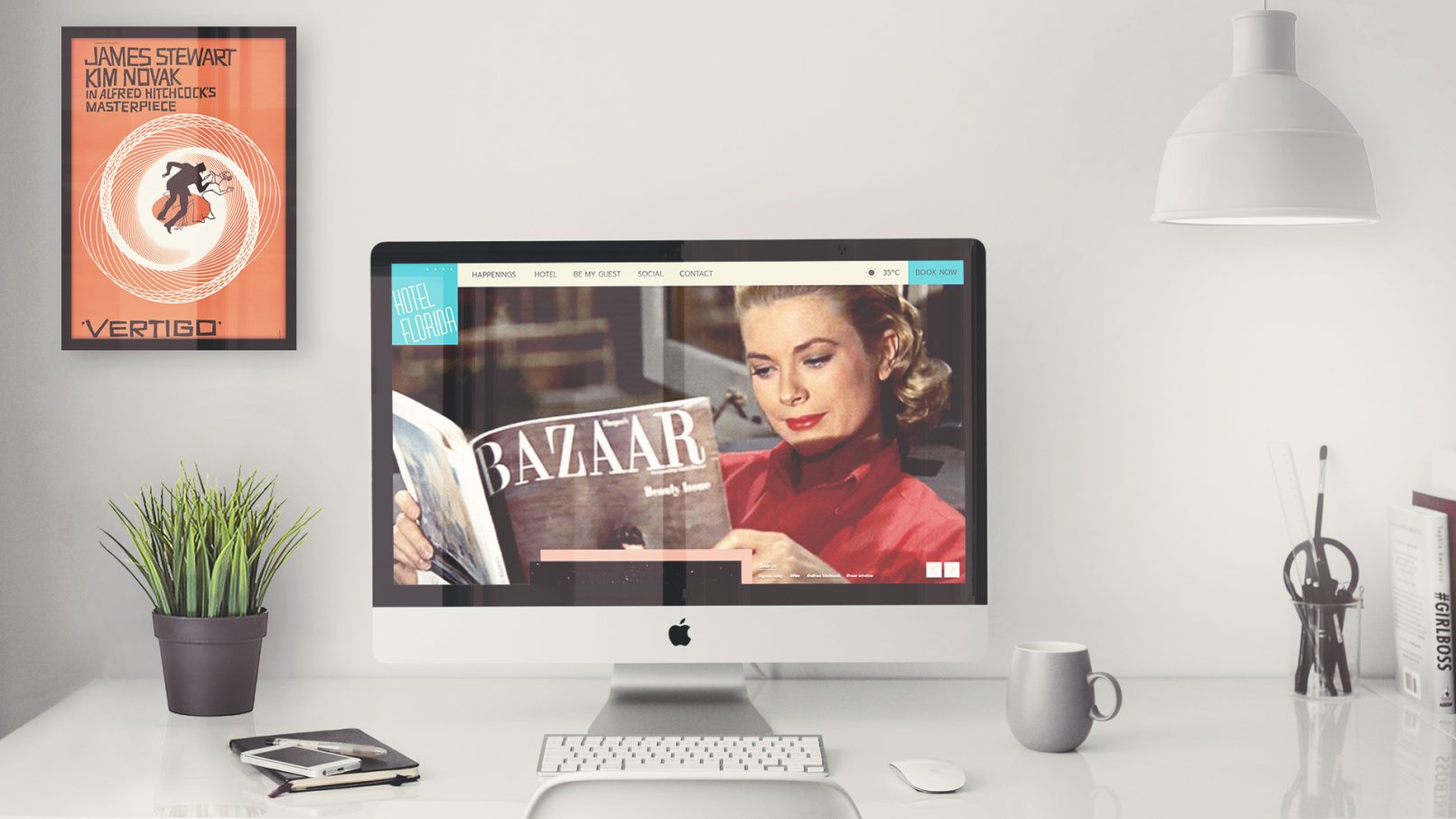 Proposal for a website for Hotel Florida, inspired by cinema and with a vintage atmosphere, its 72 rooms and common areas have a unique decoration.