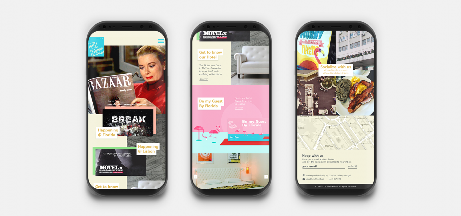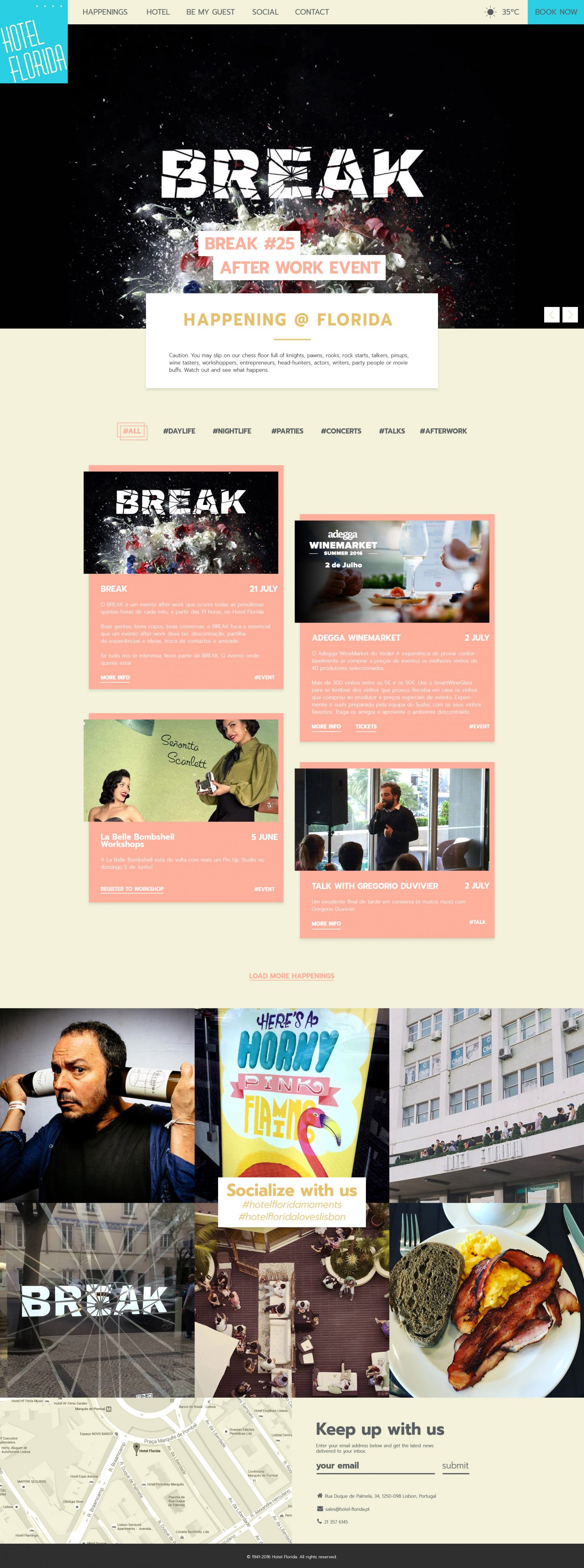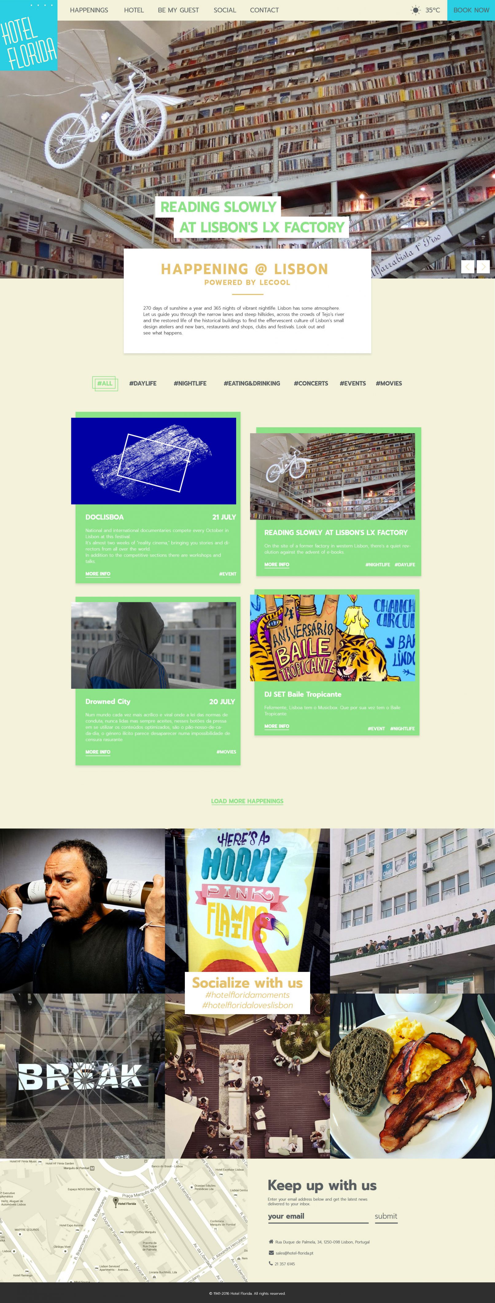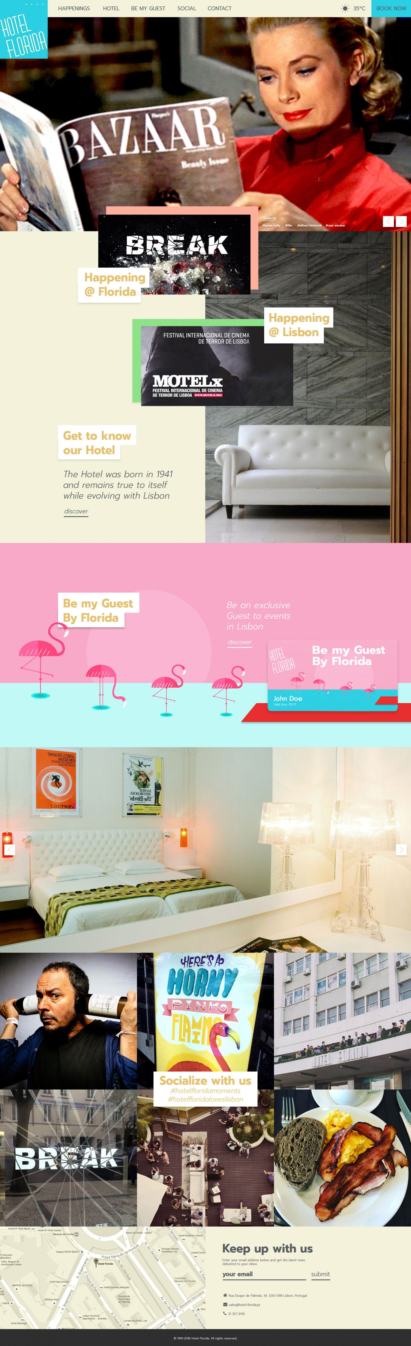 Proposal for a website for Hotel Florida, inspired by cinema and with a vintage atmosphere, its 72 rooms and common areas have a unique decoration.