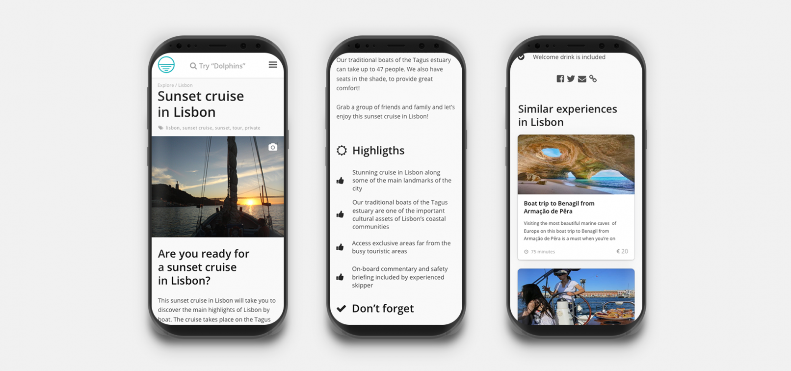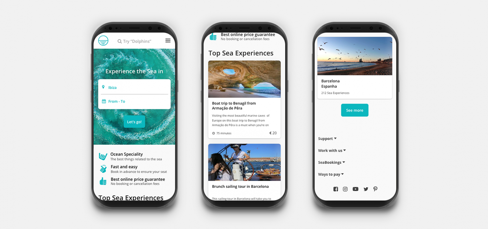 SeaBookings was born by the passion for the sea by the Dutch sisters Bo and Femke Irik in 2014. SeaBookings is an online platform where searching, comparing and booking sea related activities is made easy. Having started in Portugal, the platform now also covers Spain and is ready to conquer the Mediterranean. This international expansion and demanding market made SeaBookings’ team decide it was time for a totally new platform and image. The goal is to strengthen SeaBookings’ brand in the global competitive travel industry and, most of all, to bring travelers even closer to the most authentic sea experiences by improving the user experience of the platform.